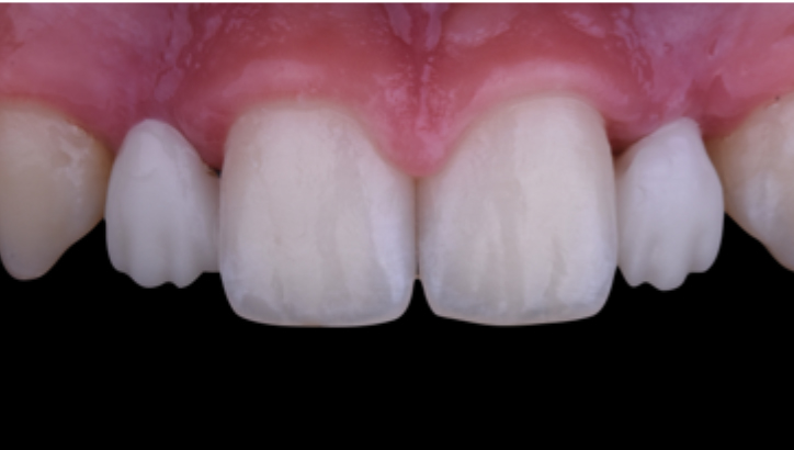 4. Final form with veneering with Emax Ceram ceramics (Ivoclar Vivadent). (Figure 12) Ovate pontic form in cervical areas of lateral incisors would influence final soft tissue contour. In this case soft tissue tunnel graft was applied to mask missing bone volume in area 12 and 22. (Figures 13, 14)